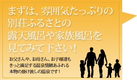 湯布院の中でも珍しい敷地内にある源泉を直接ひいた別荘 ふるさとの温泉。源泉かけ流しの温泉を露天風呂や家族風呂に直接ひいた新鮮な温泉は、たっぷり新鮮なお湯が24時間かけ流されています。